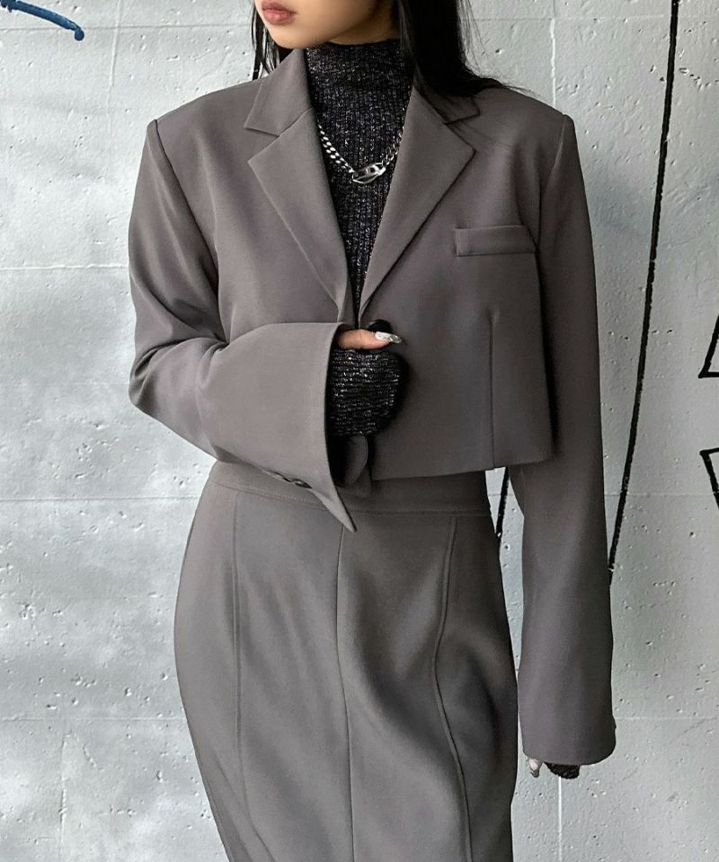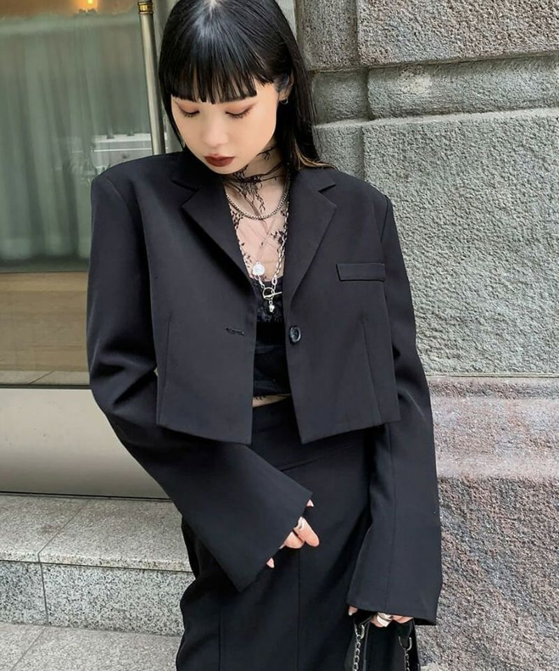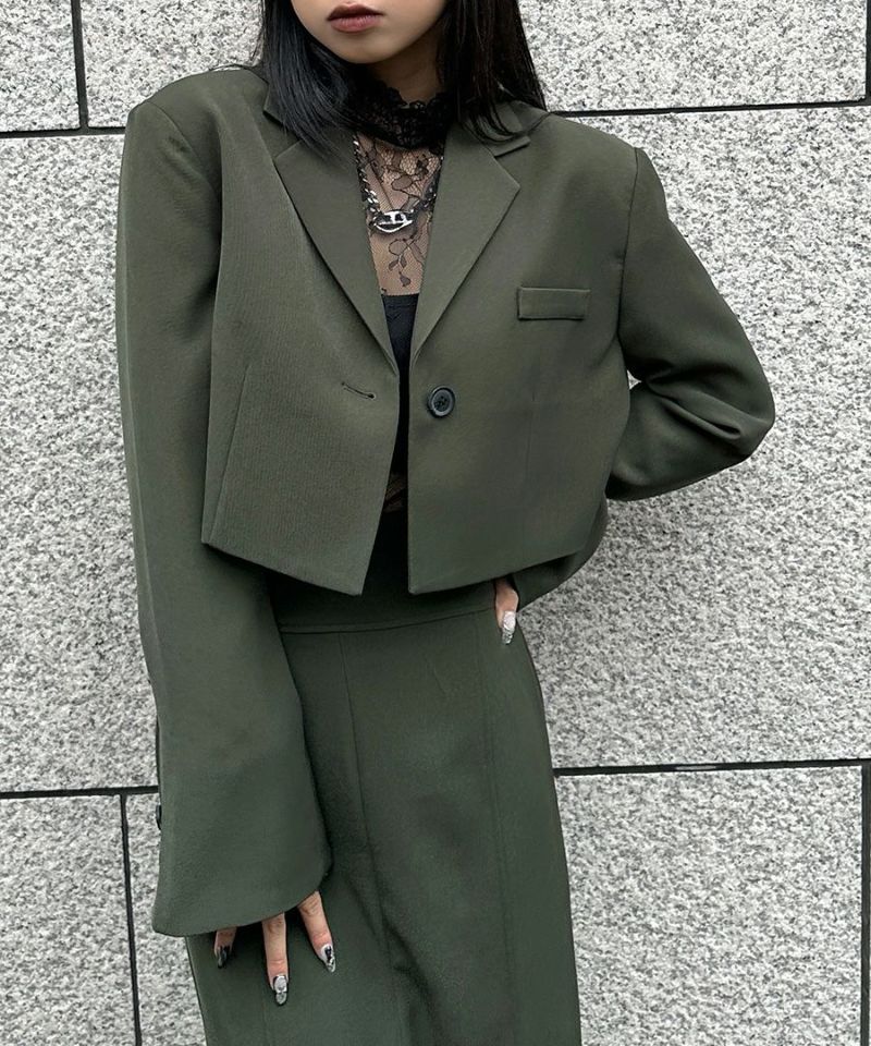 長めの袖丈にフレアカフスデザインをプラスした スタイリッシュなデザインジャケット。 短めのクロップド丈がウエストを細く見せ、スタイルアップ効果を発揮。 程良いボリューム感の肩パッドを採用し、美しいシルエットに仕上げました。