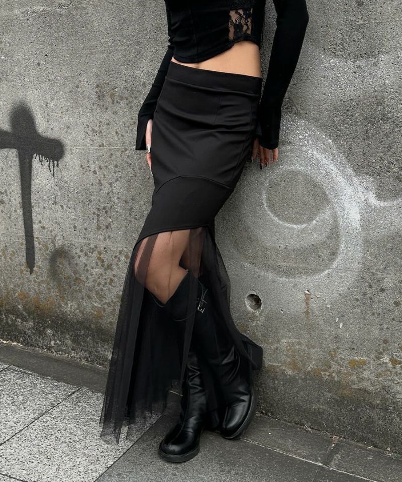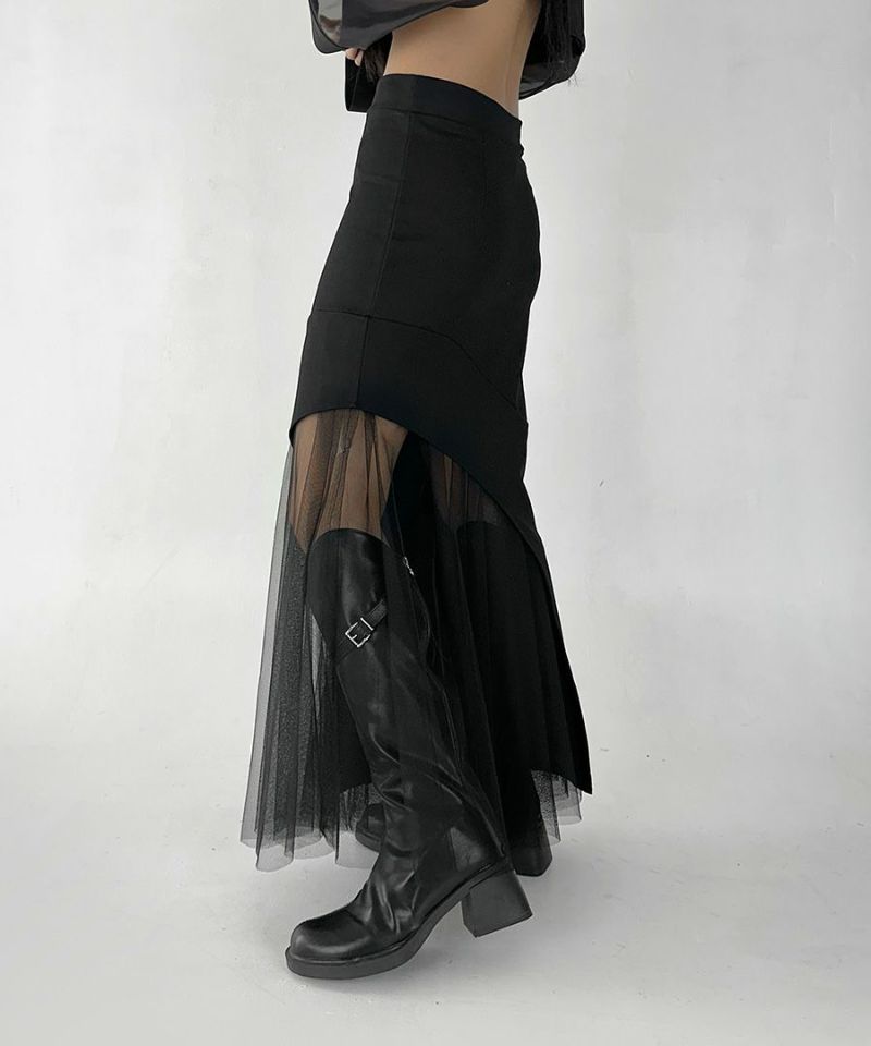 贅沢にシアー素材をあしらったスカート。 アシメデザインで差別化も叶うアイテムです。