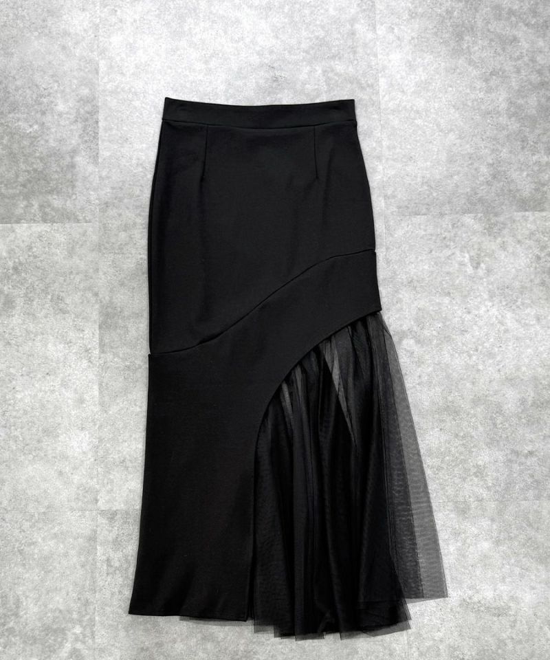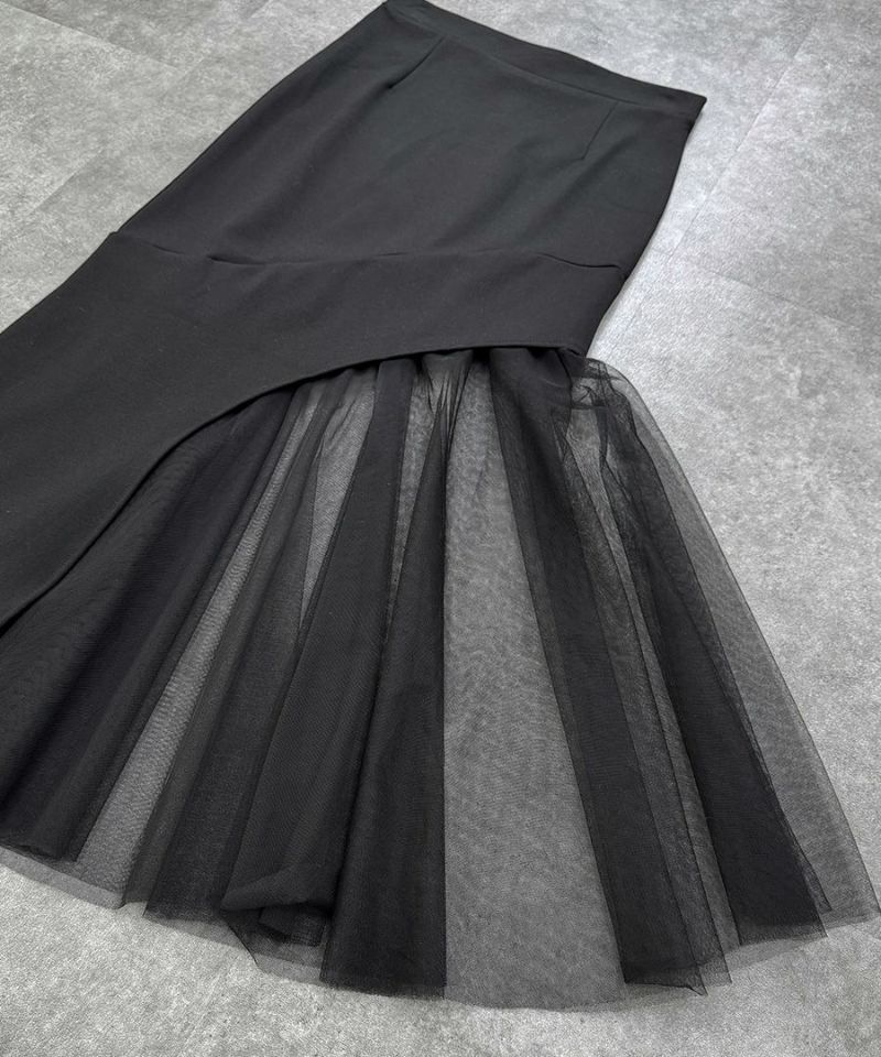 伸縮性に優れた生地は優しい肌触りで 女性らしいシルエットを演出してくれます。 ウエストや腰まわりをすっきりさせたシルエットに ボリュームのあるシアー素材をMIXしたことで 上品なマーメイドシルエットに◎