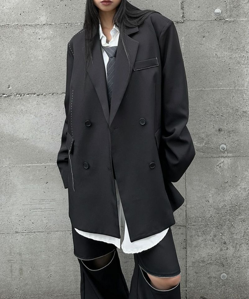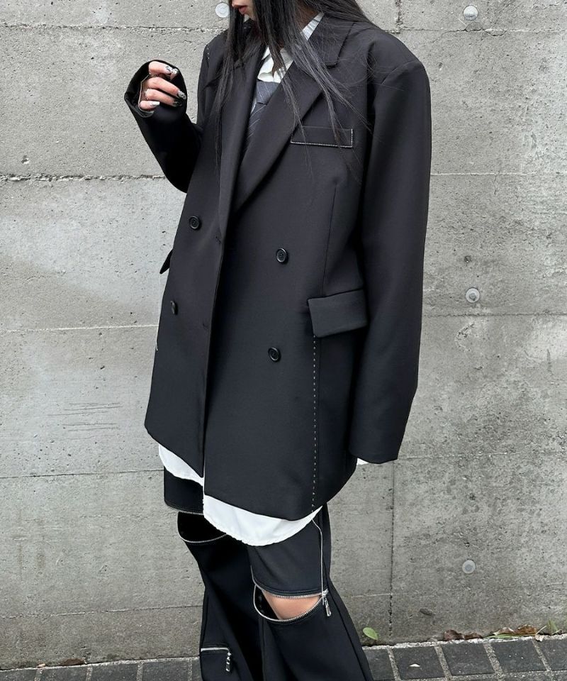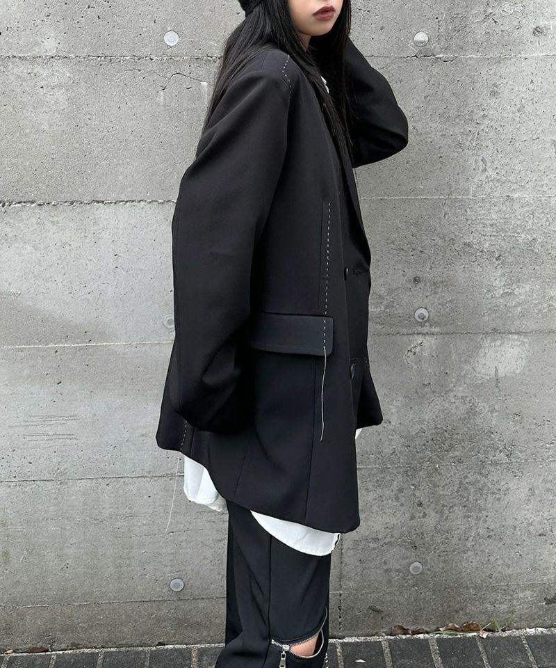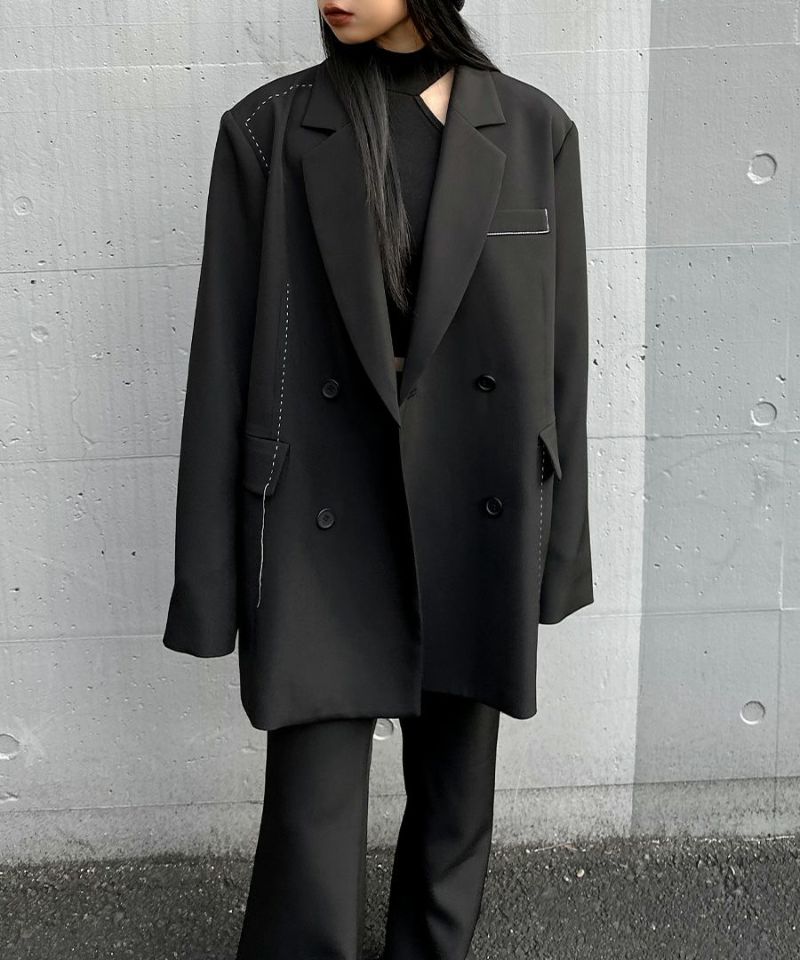 シンプルなシルエットに白ステッチで 個性を引き立たせたジャケット。 ステッチの大きさから糸の太さまで こだわり抜いたアイテムです。 メンズライクなオーバーサイズで マニッシュでありながら抜け感のある印象を与えてくれます。