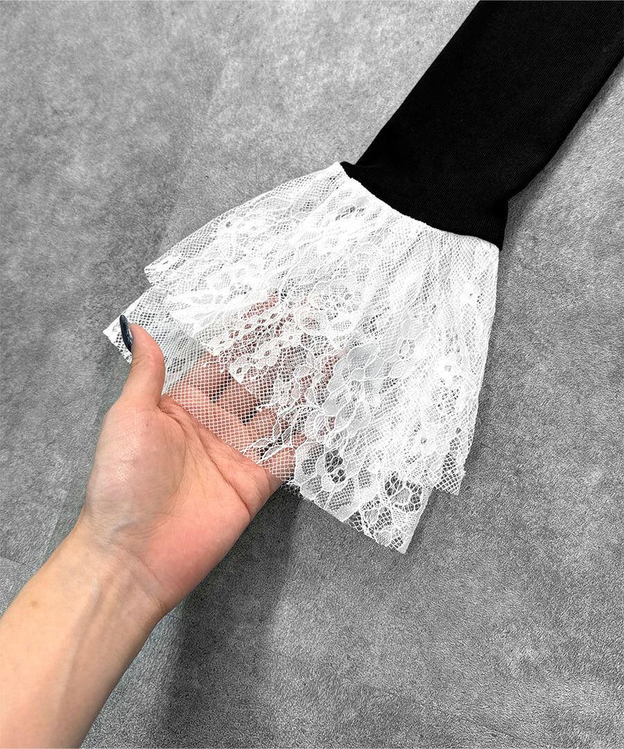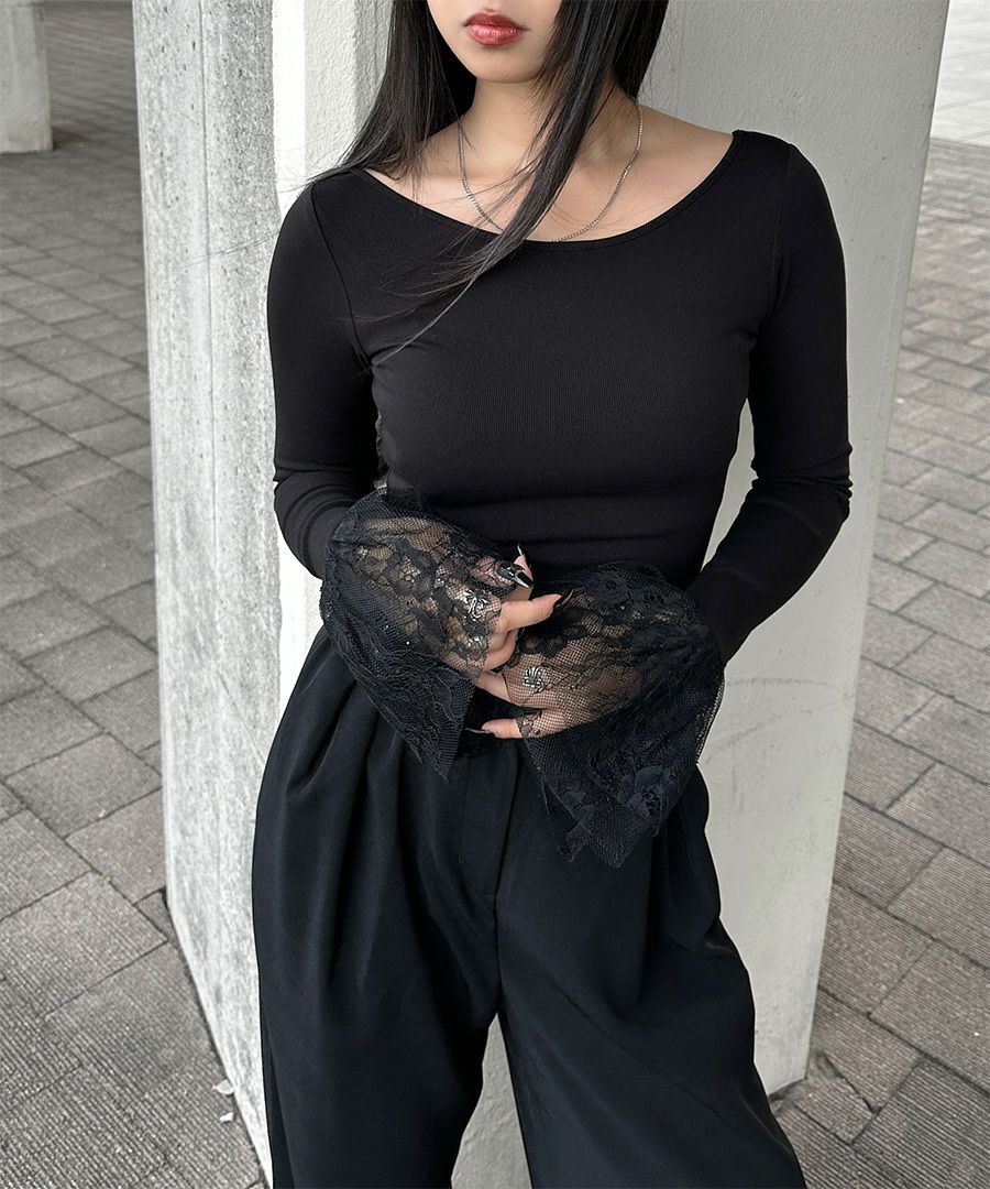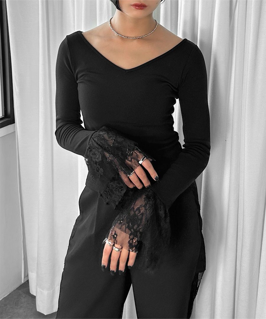 贅沢な2枚重ねレースのベルスリーブが華やかなトップス。