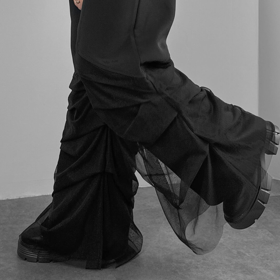 たっぷりとタックを取ったチュールレイヤードがポイントのワイドパンツ。