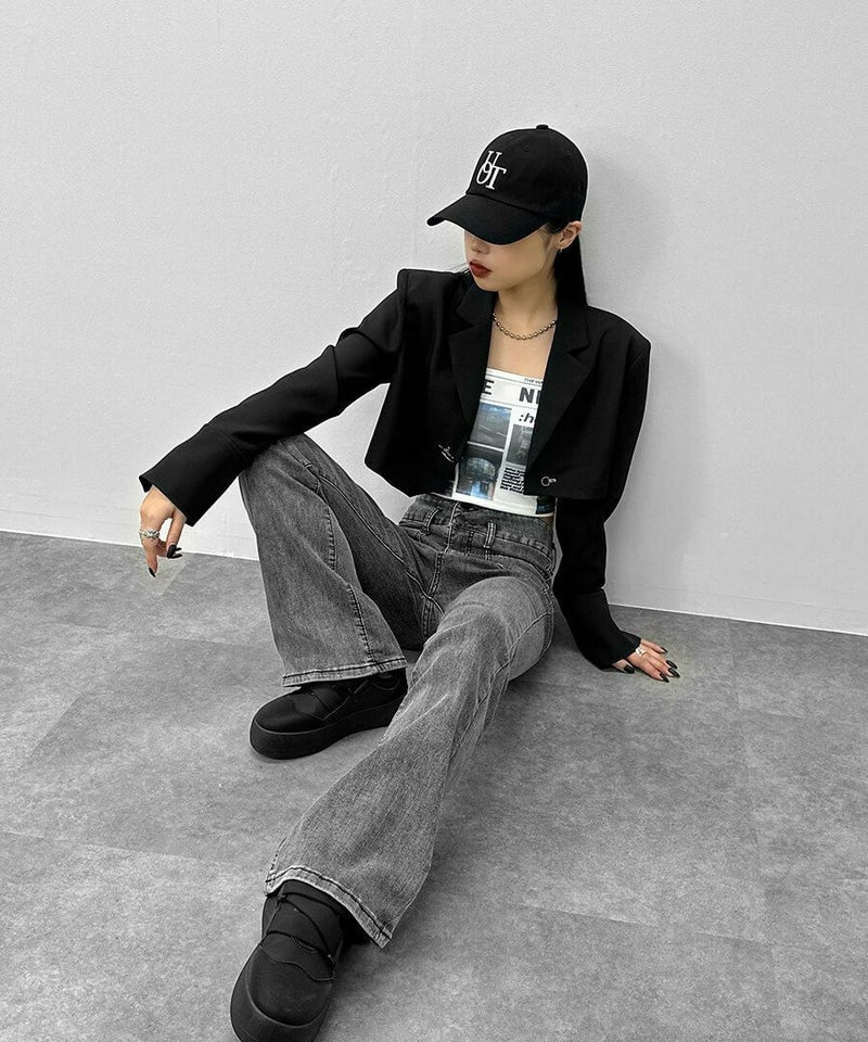 コンパクトなシルエットに アシメデザインを取り入れたジャケット。 フロントフックとカフスボタンは 光沢のあるシルバーを採用し モード感漂うデザインに仕上げました。