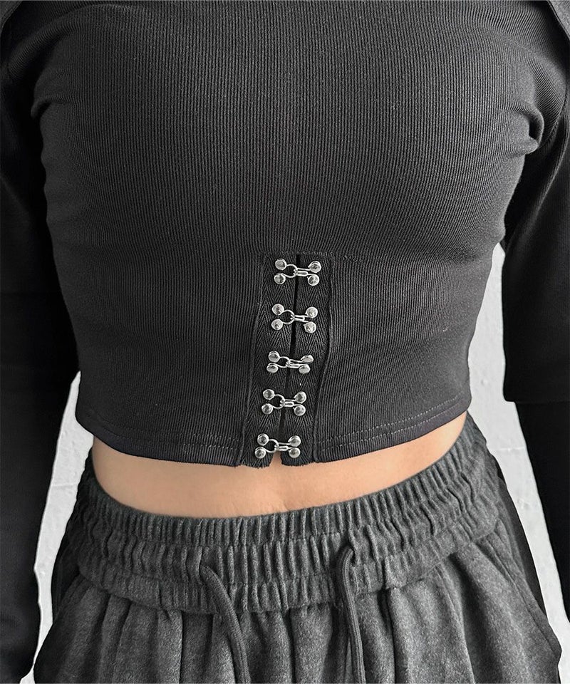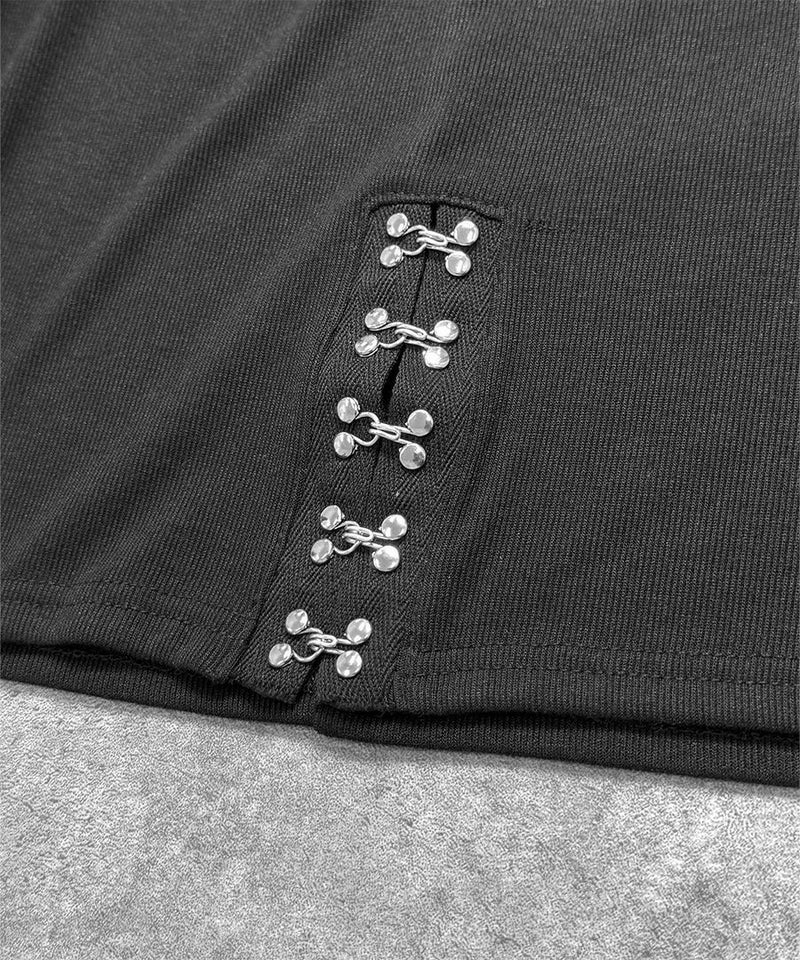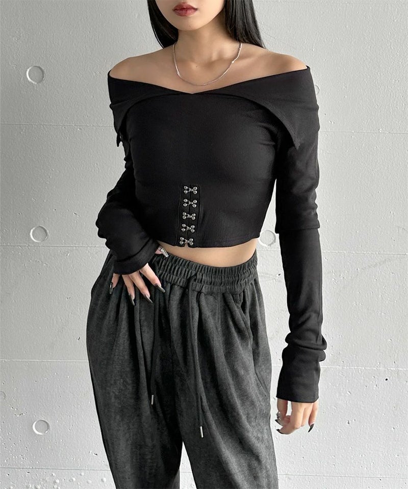 デコルテを美しく見せてくれる オフショル×フィットシルエットのトップス。 ホックデザインが視線を引き寄せ 立体的なアクセントになってくれます。 ホックは取り外し可能なので 気分に合わせて雰囲気を変えることも◎