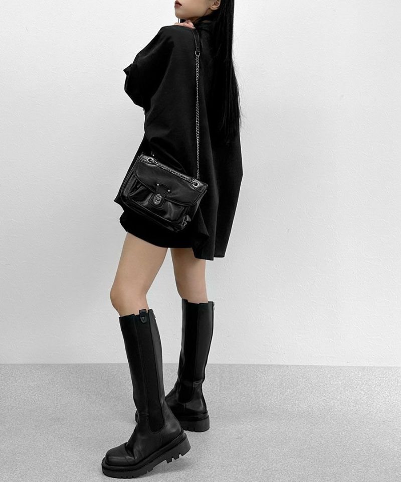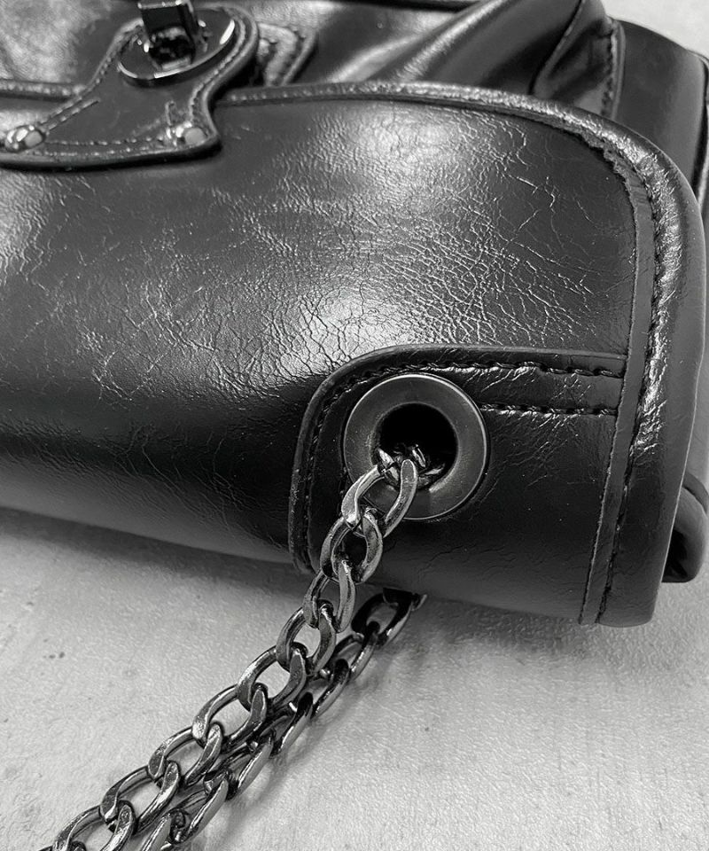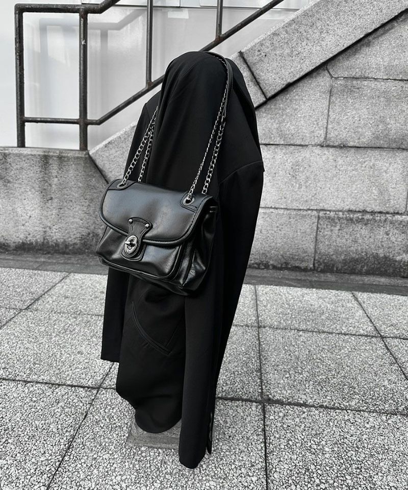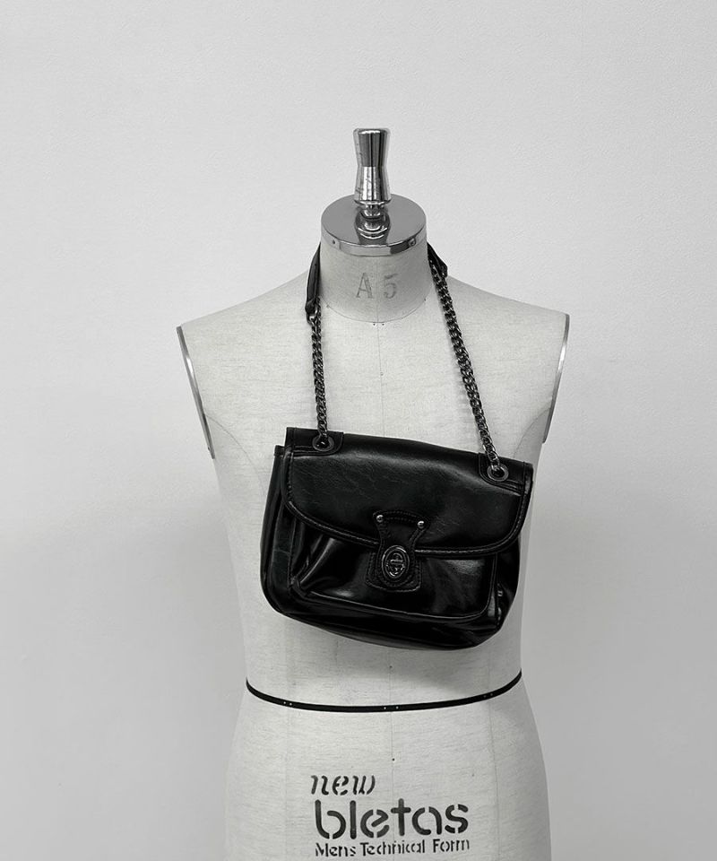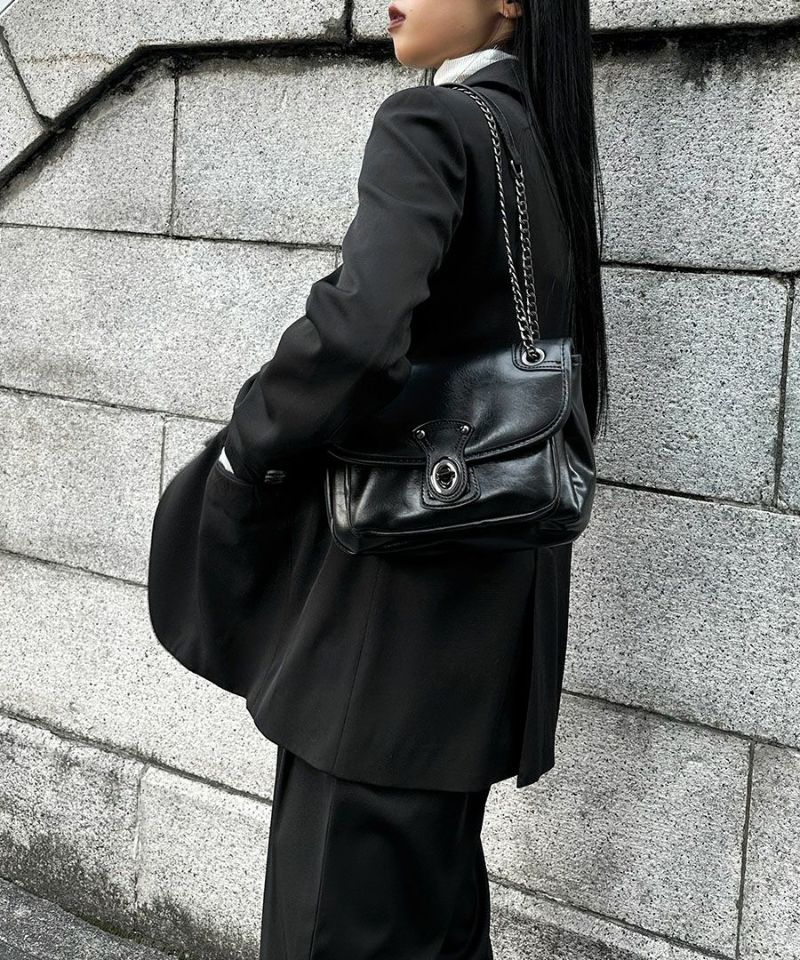 ブラックニッケルのショルダーチェーンがモード感のあるフラップバッグ。 チェーンはそのまま使って斜め掛けショルダーとしても、 2連にして肩掛けや手持ちスタイルにも対応できる2way仕様。
