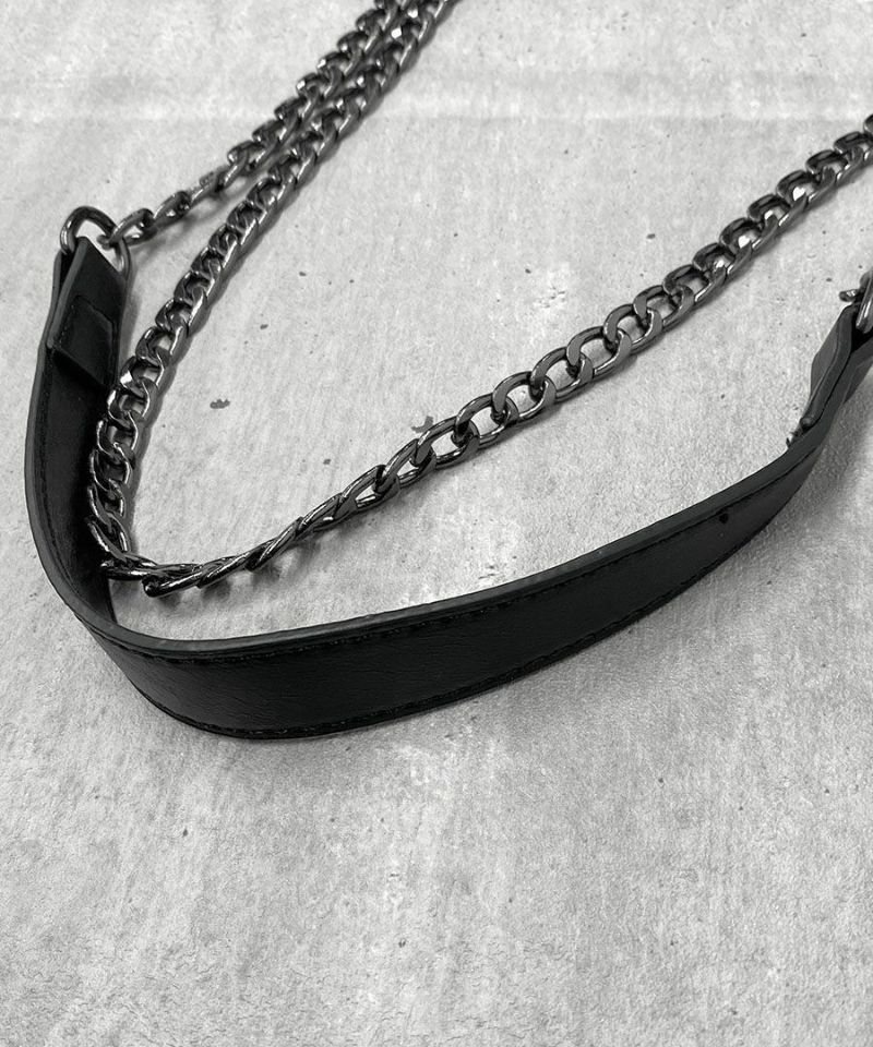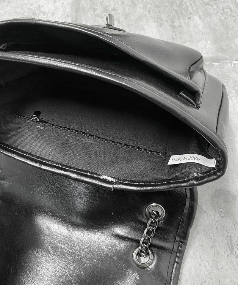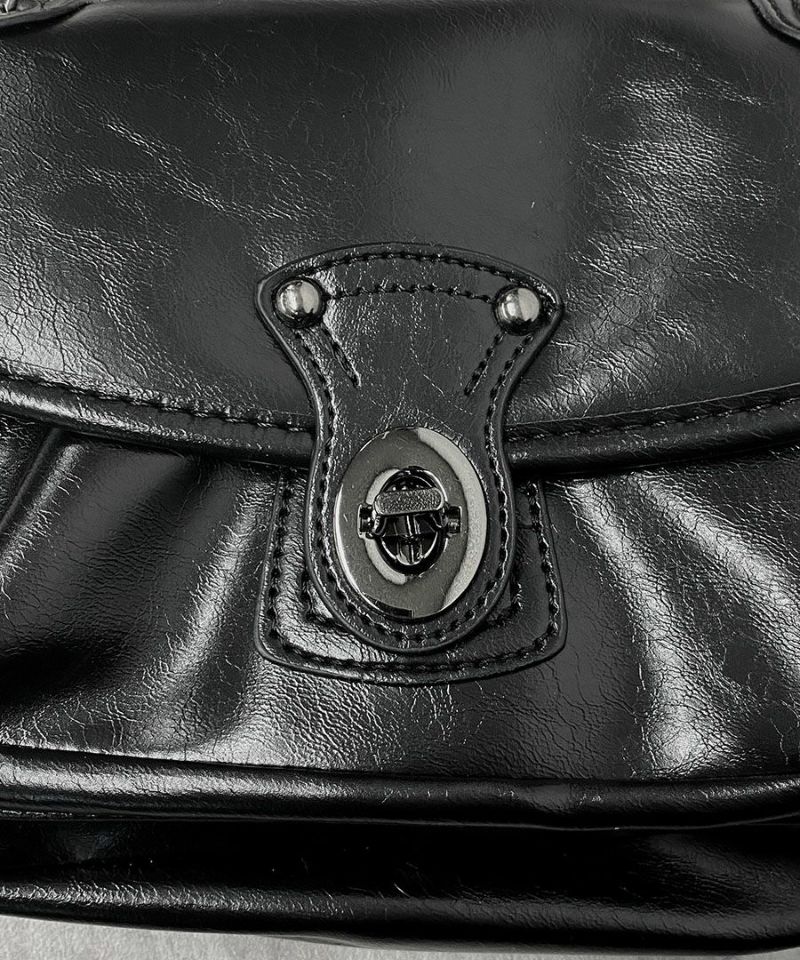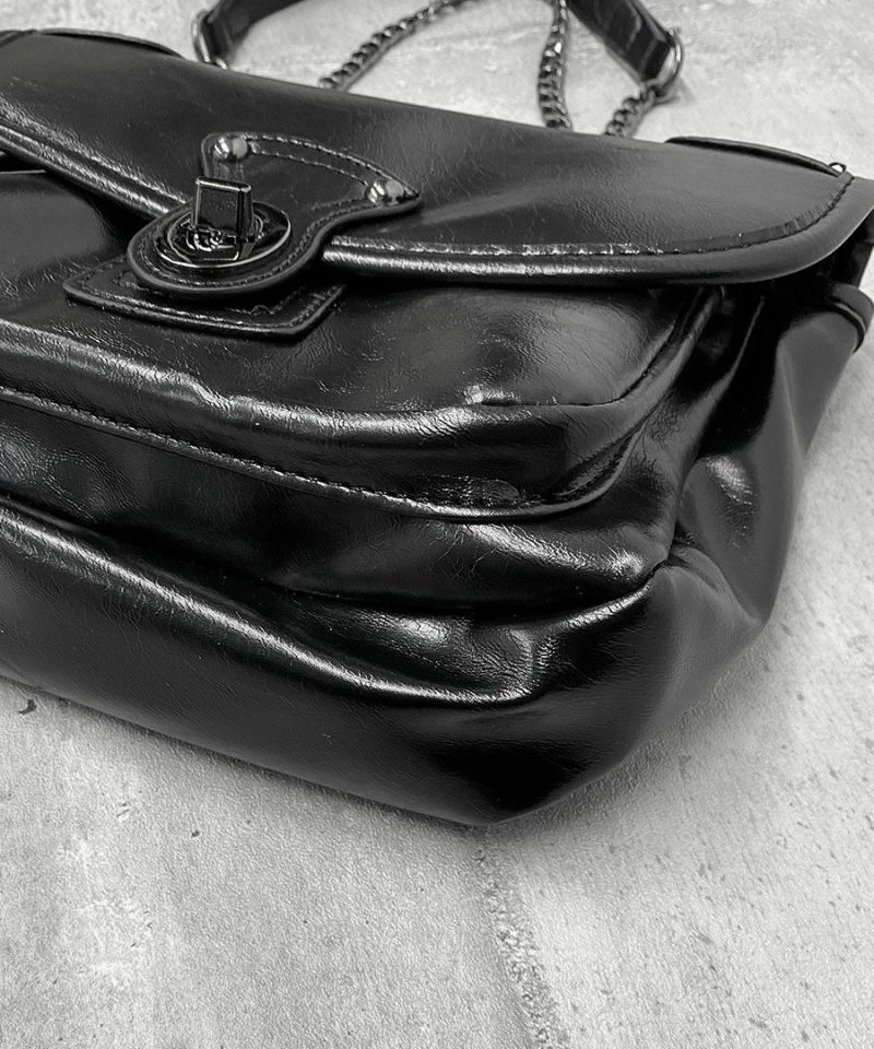 ツヤ感のあるフェイクレザーと ブラックニッケルのパーツでモード感◎