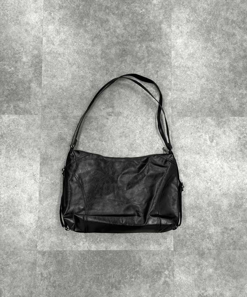 光沢のあるレザーが コーデのアクセントになるバッグ。 フロントのダブルベルトがポイントになっています。