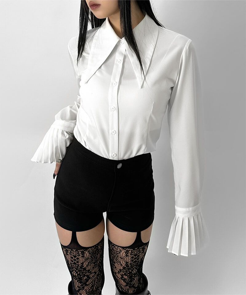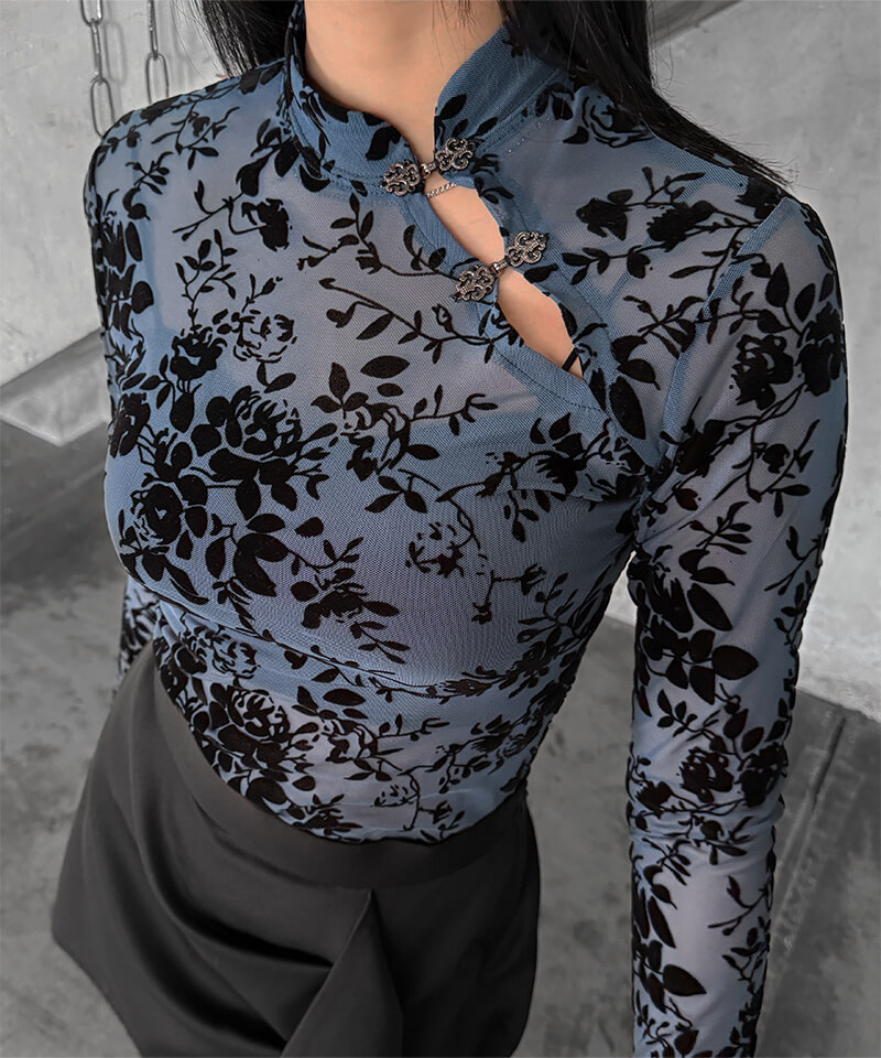 斜めメタルホックデザインでチャイナ風に仕上がったトップス。