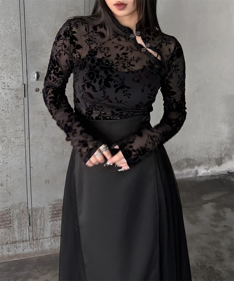 伸縮性のあるメッシュ素材にベロアレースを重ねた立体的な生地で