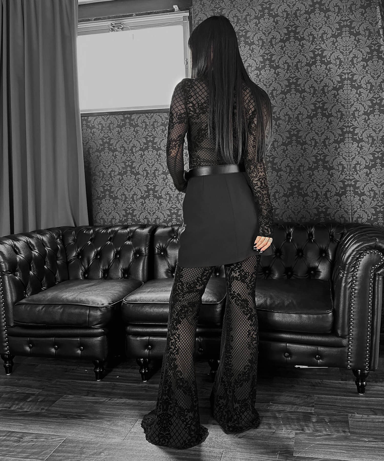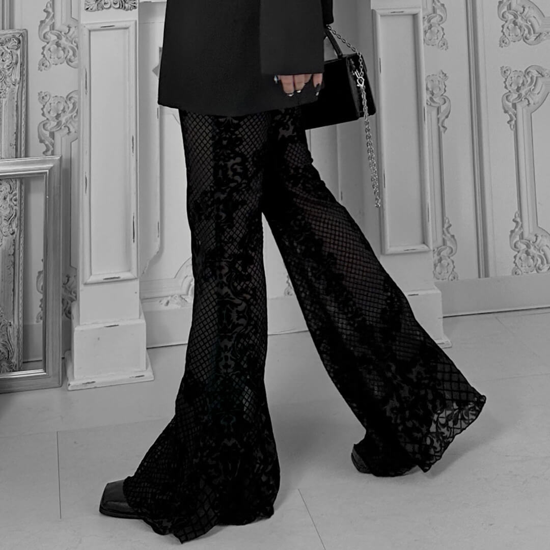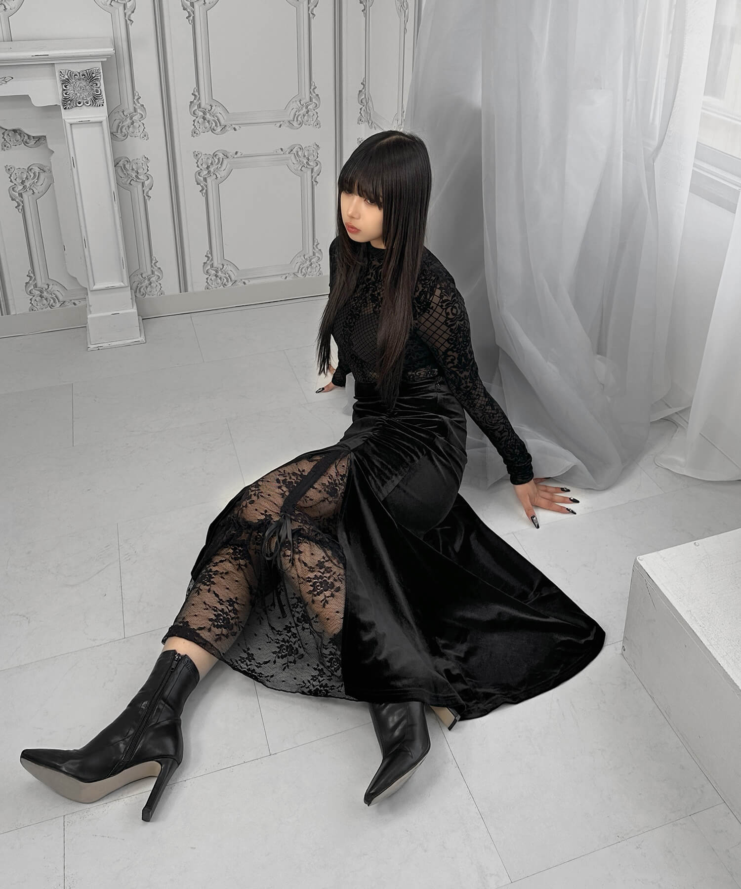 ベロアのレースデザインとたっぷりと広がるフレアシルエットで