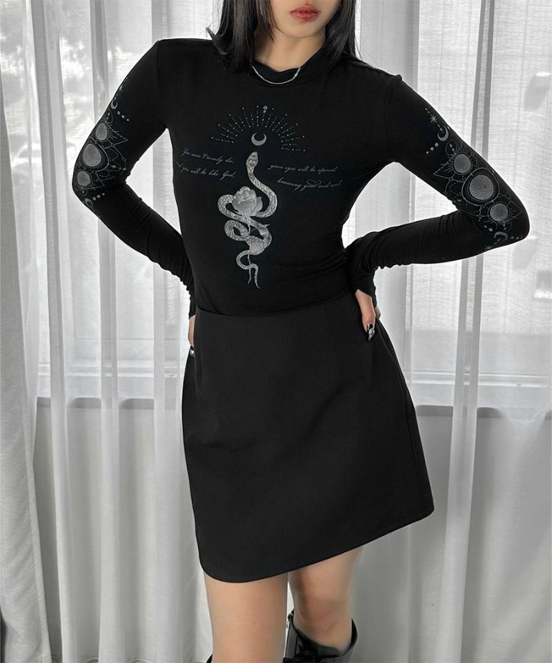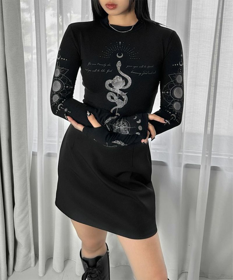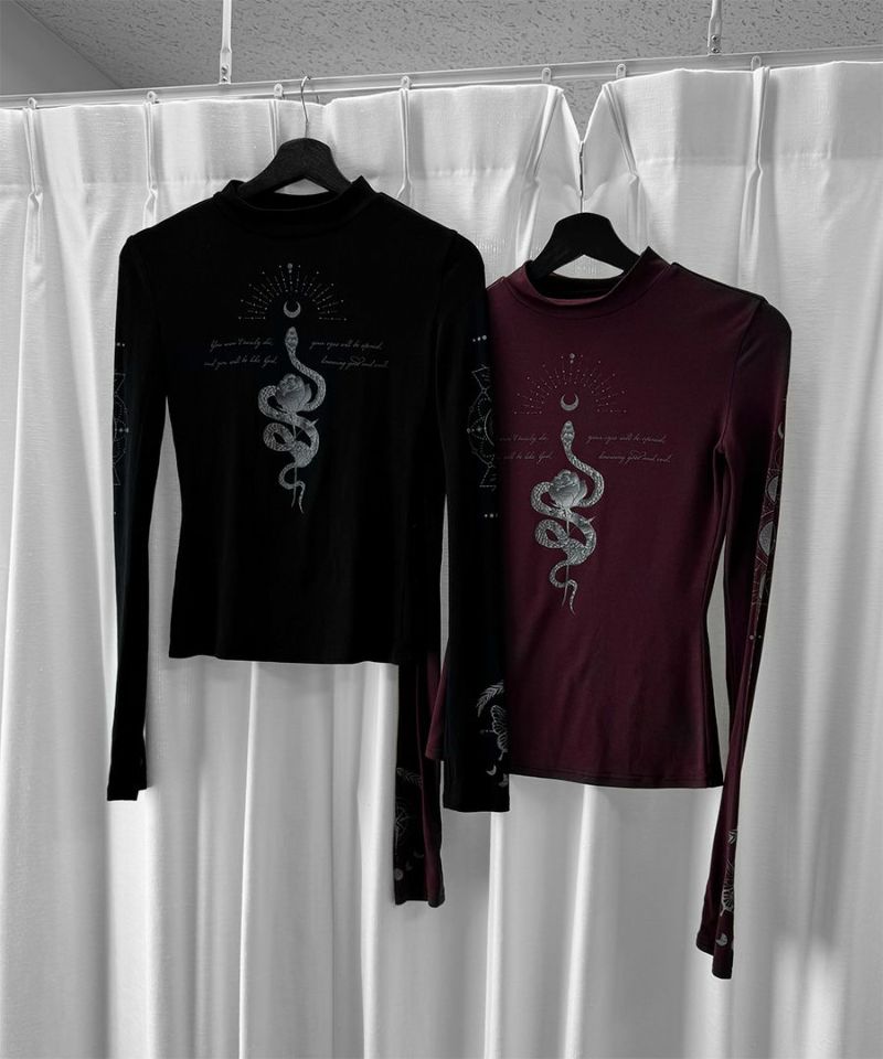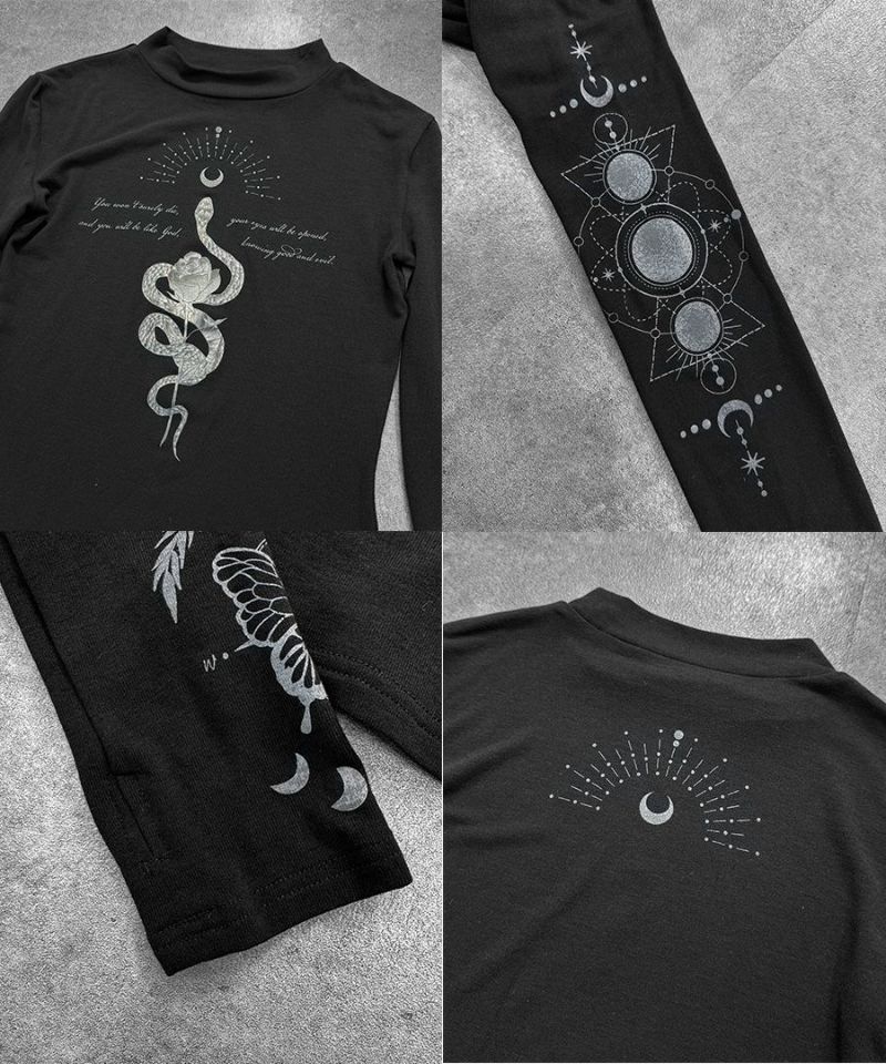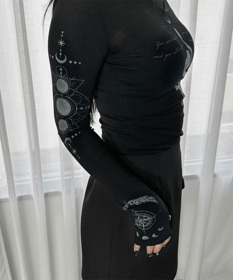 まるでタトゥーのようなグラフィックデザインが コーデのアクセントになるトップス。 指空きデザインで手元まで モードな世界観を引き立ててくれます。 大きすぎず、小さすぎないジャストな丈感で 着回しが効くのも嬉しいポイント◎