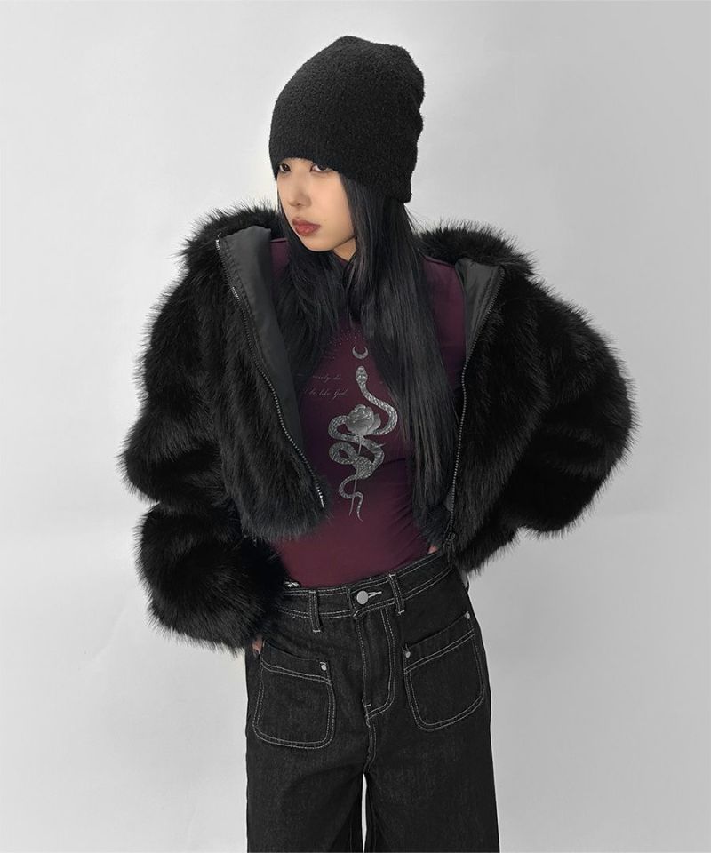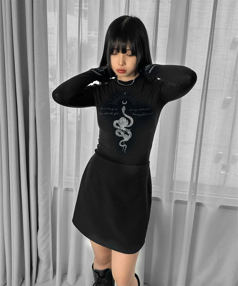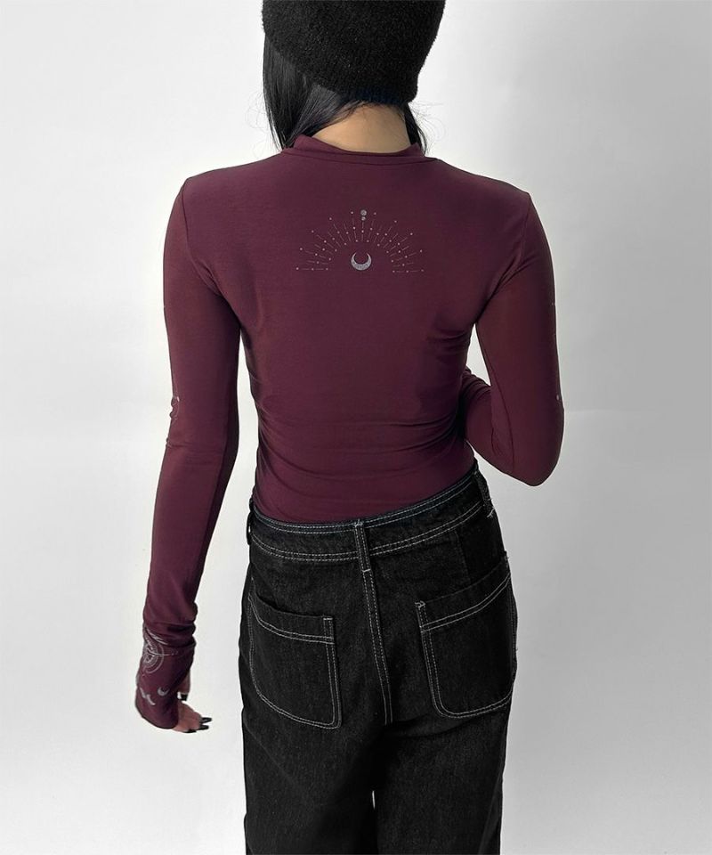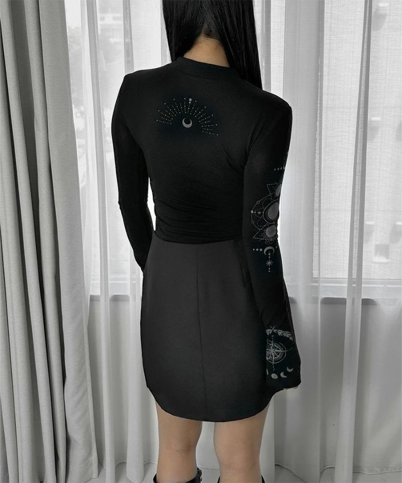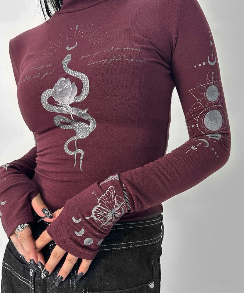 まるでタトゥーのようなグラフィックデザインが コーデのアクセントになるトップス。 指空きデザインで手元まで モードな世界観を引き立ててくれます。 大きすぎず、小さすぎないジャストな丈感で 着回しが効くのも嬉しいポイント◎