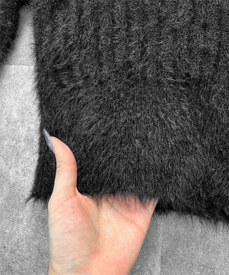 大人っぽさ溢れるBLACKと コーデのアクセントになるBLUEの2色展開。 柔らかな質感の毛足が長いシャギー素材は チクチクしないストレスフリーな着心地です。 細めのリブ編みは伸縮性抜群で 華奢なシルエットを演出してくれます。