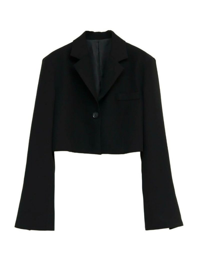 長めの袖丈にフレアカフスデザインをプラスした スタイリッシュなデザインジャケット。 短めのクロップド丈がウエストを細く見せ、スタイルアップ効果を発揮。 程良いボリューム感の肩パッドを採用し、美しいシルエットに仕上げました。