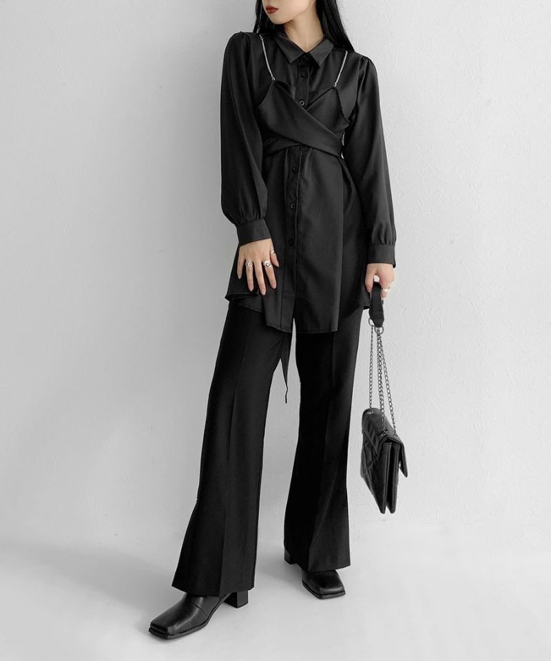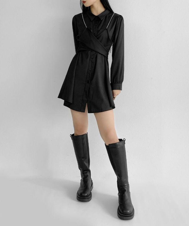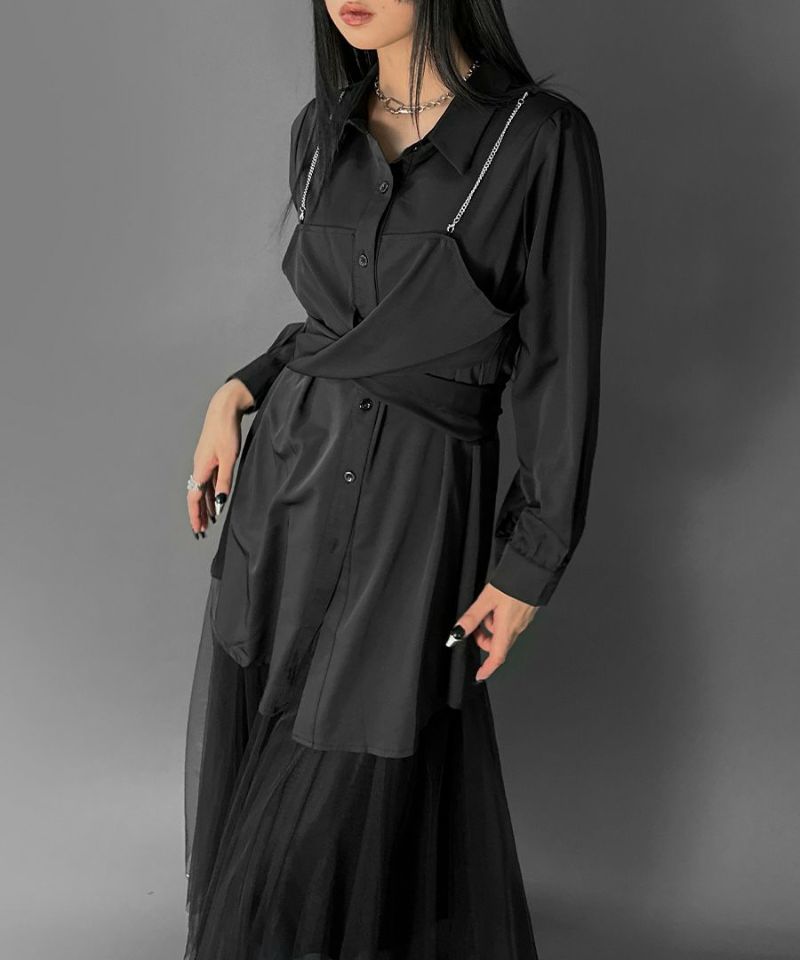 ショルダーチェーンデザインがモード感のあるミニ丈のシャツワンピ。