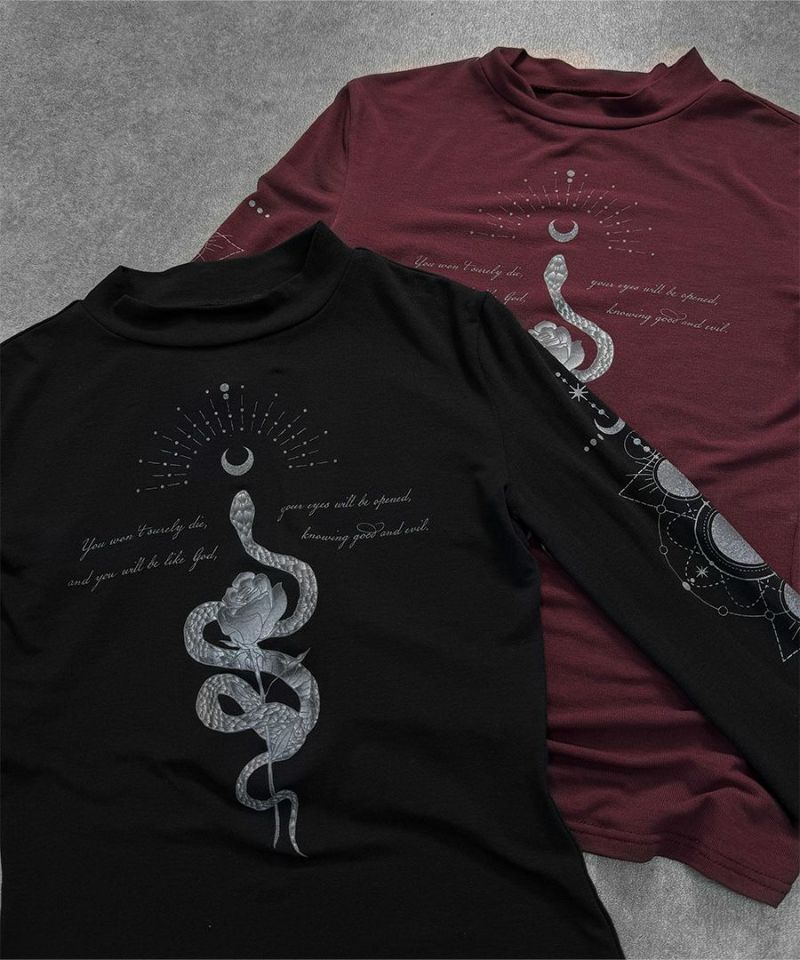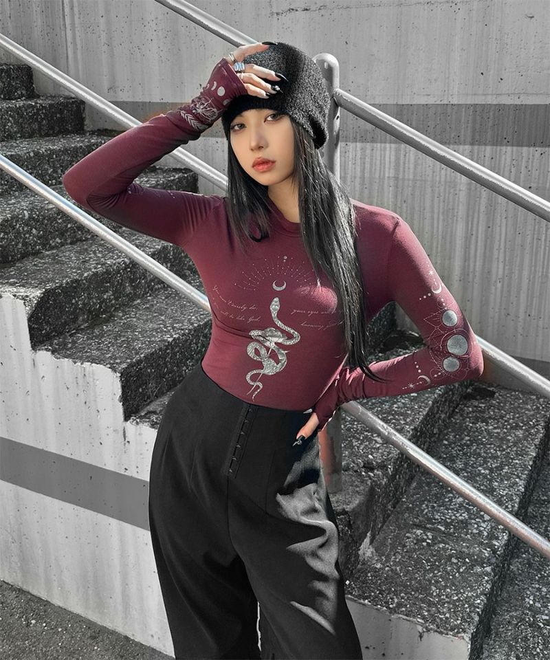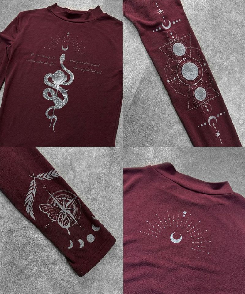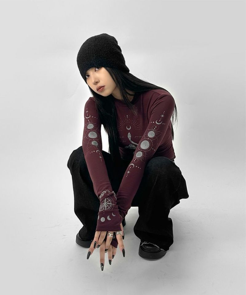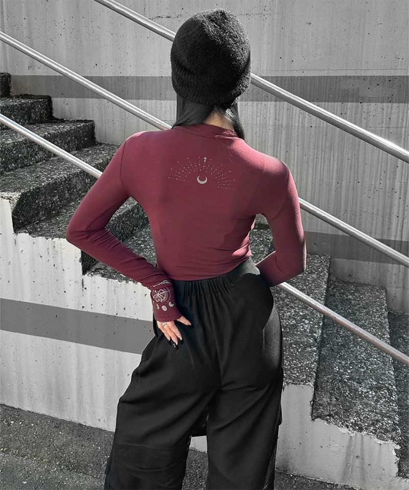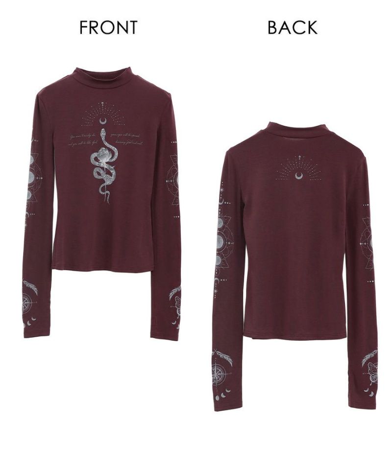 まるでタトゥーのようなグラフィックデザインが コーデのアクセントになるトップス。 指空きデザインで手元まで モードな世界観を引き立ててくれます。 大きすぎず、小さすぎないジャストな丈感で 着回しが効くのも嬉しいポイント◎