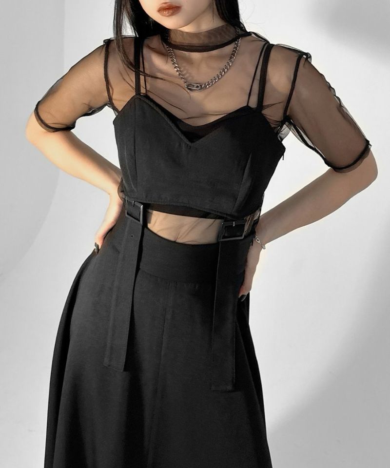 ビスチェとフレアスカートをベルトディテールで繋げた