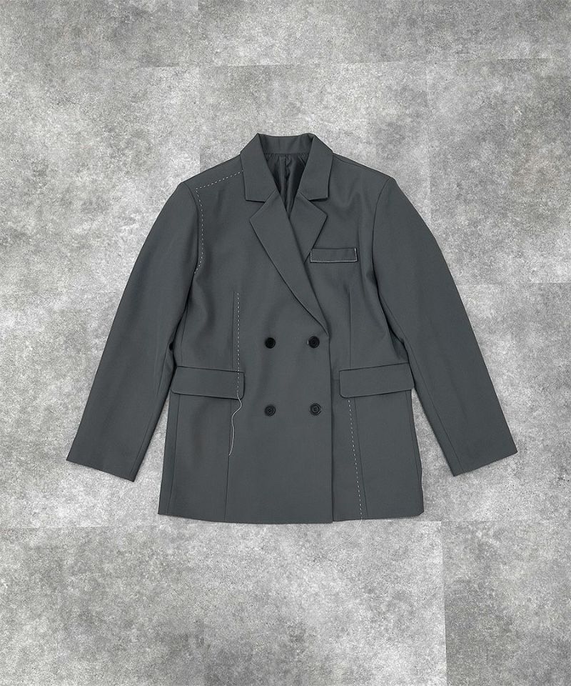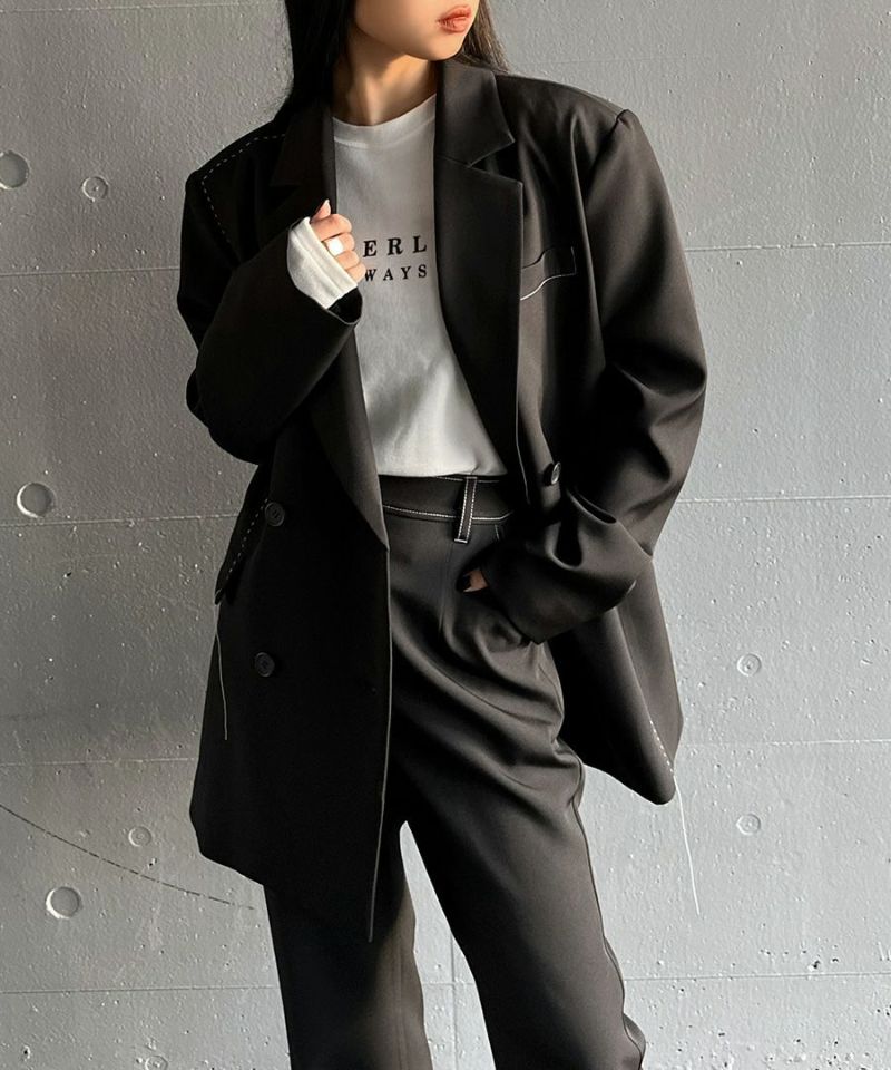 シンプルなシルエットに白ステッチで 個性を引き立たせたジャケット。 ステッチの大きさから糸の太さまで こだわり抜いたアイテムです。 メンズライクなオーバーサイズで マニッシュでありながら抜け感のある印象を与えてくれます。