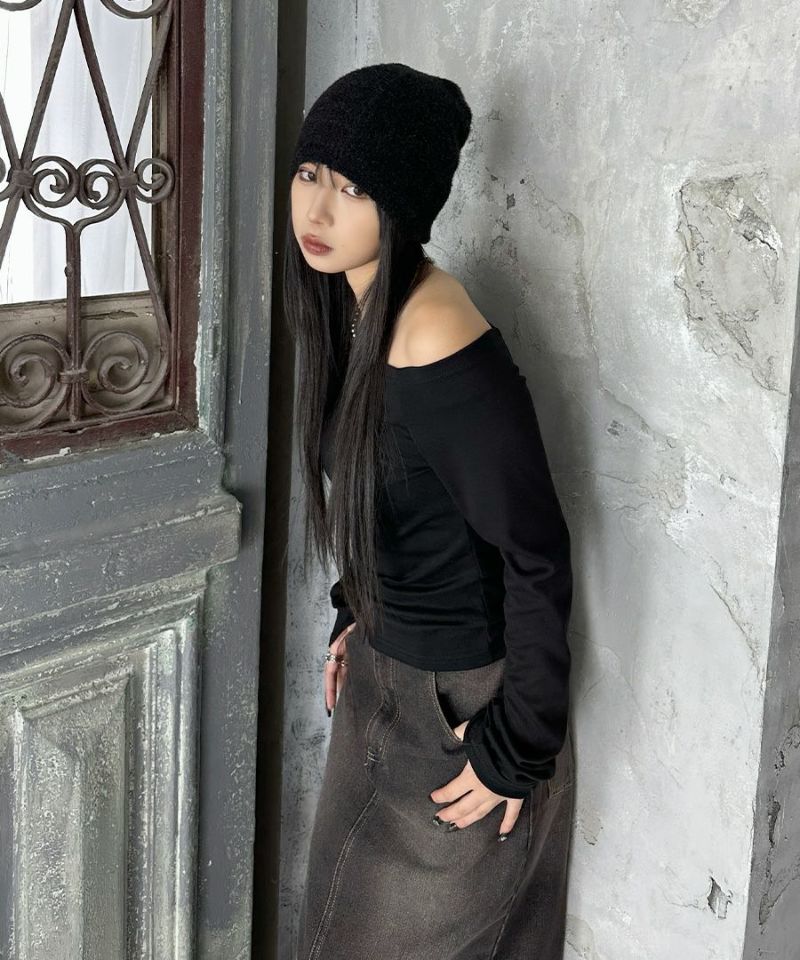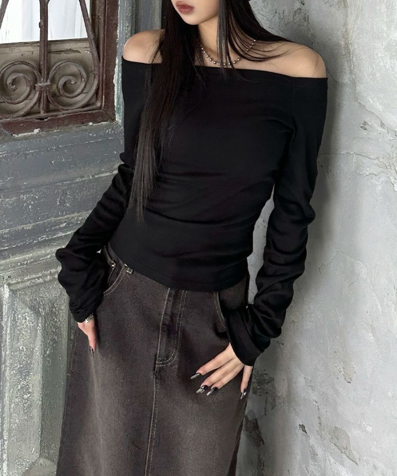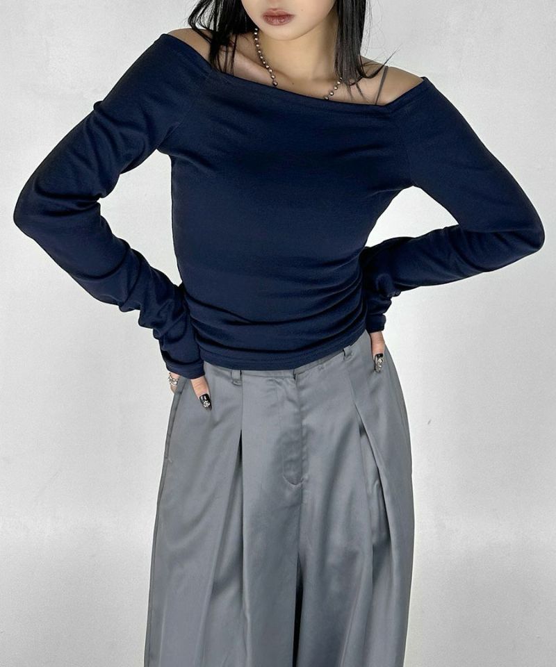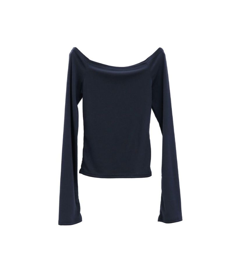 ヘルシーな肌見せが叶うトップス。 しっかりと開いたネックラインと 長めの袖丈が女性らしい印象を演出してくれます。