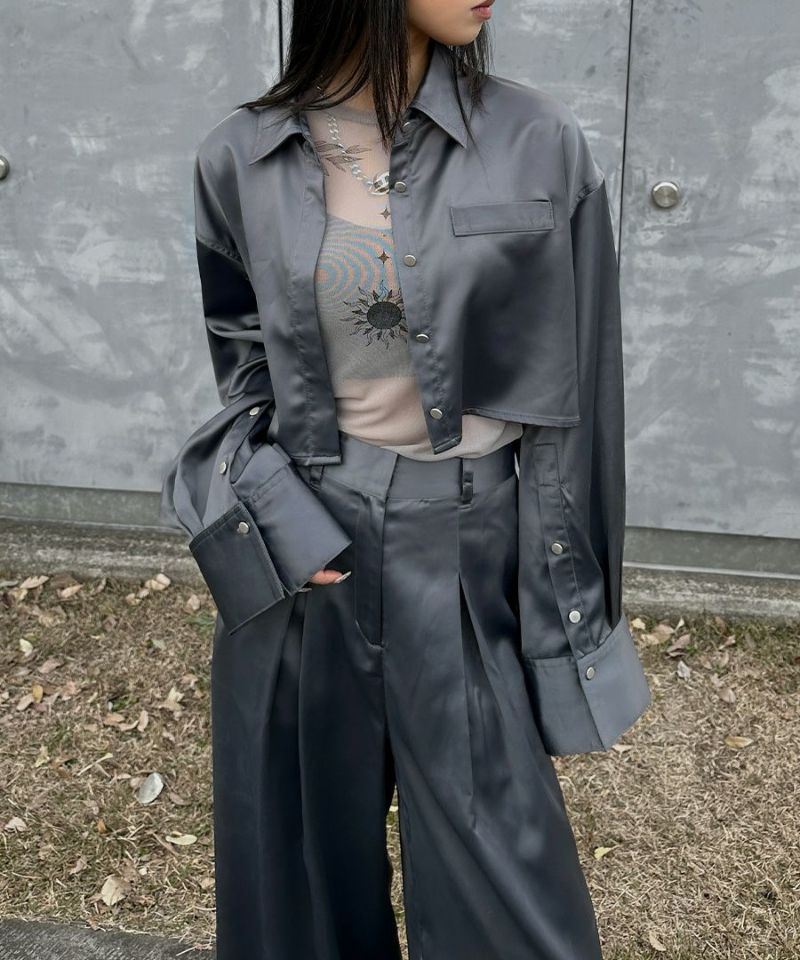 ゆったりとしたシルエットが魅力のサテンシャツ。