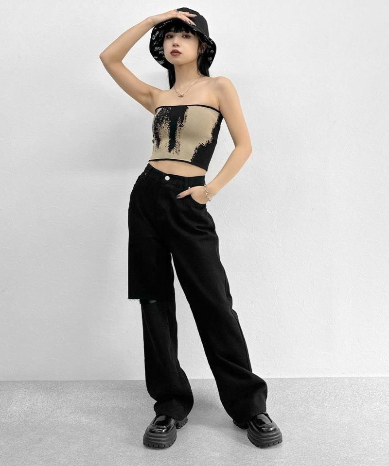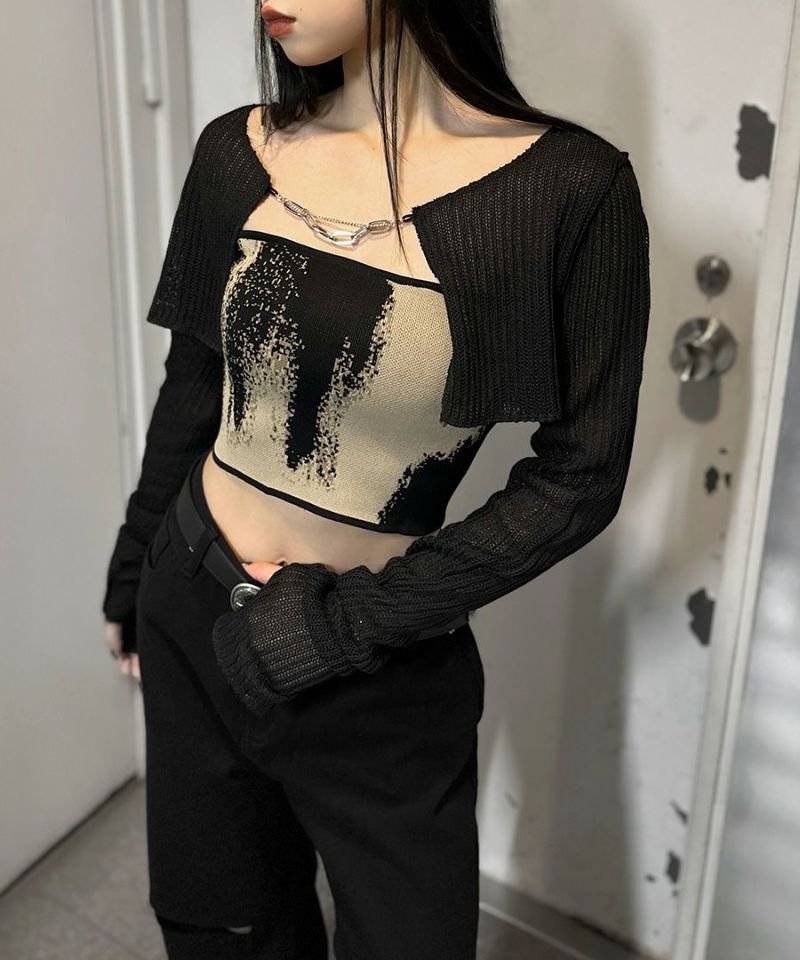 モード感のあるニュアンス柄が目を引くニットビスチェ。 しっかりとした素材感のジャカードニットを使用。 身体にフィットする付け心地でずれ落ちる心配もありません。
