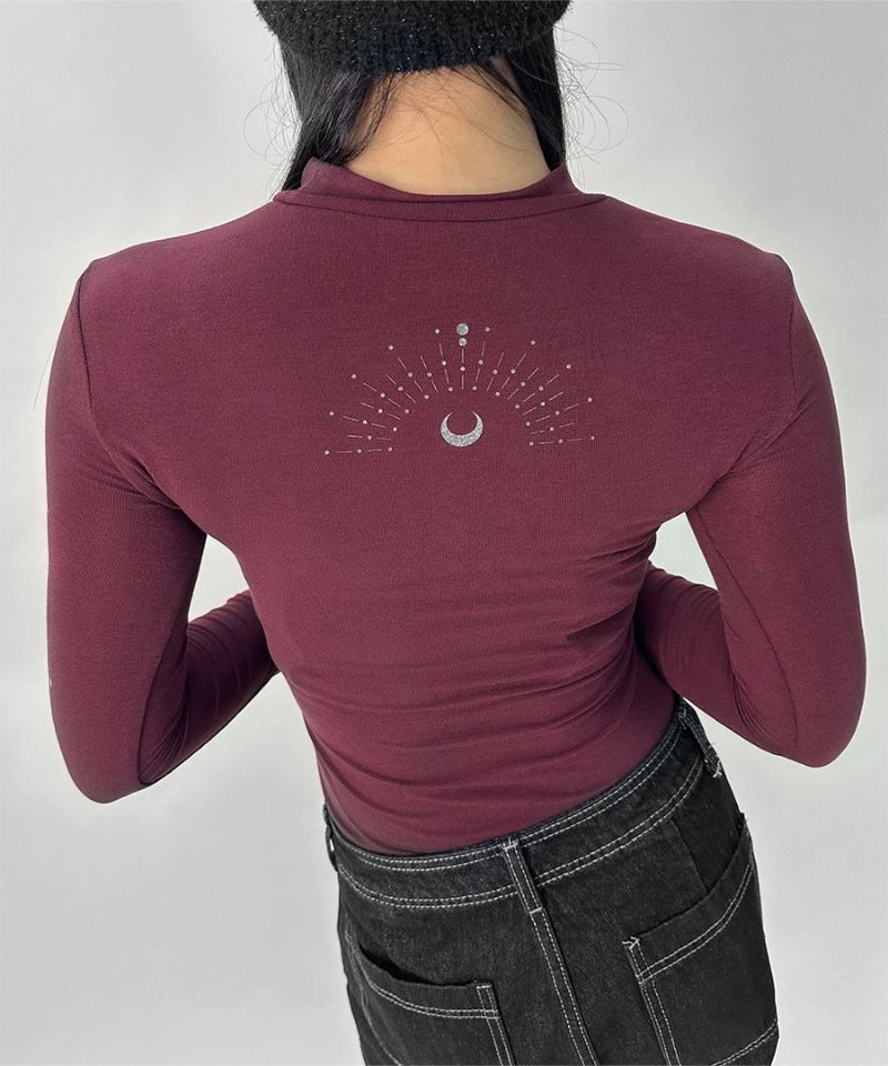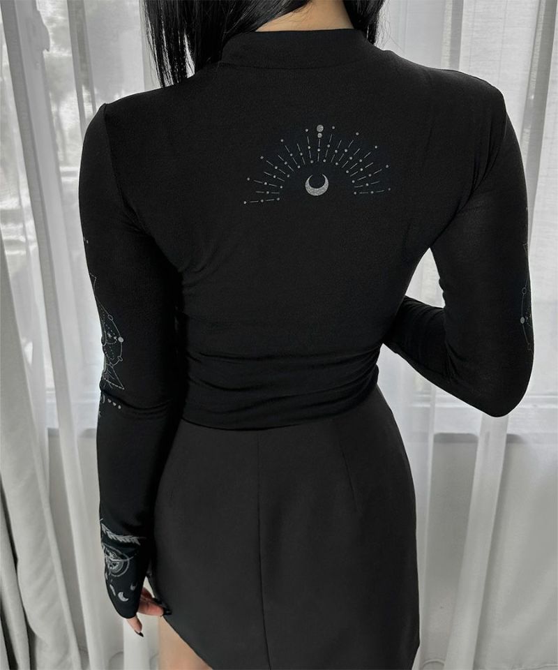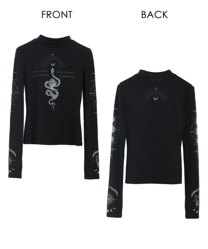 まるでタトゥーのようなグラフィックデザインが コーデのアクセントになるトップス。 指空きデザインで手元まで モードな世界観を引き立ててくれます。 大きすぎず、小さすぎないジャストな丈感で 着回しが効くのも嬉しいポイント◎