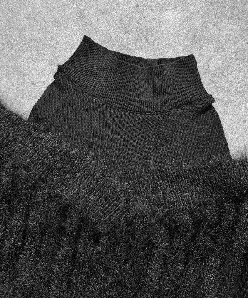 大人っぽさ溢れるBLACKと コーデのアクセントになるBLUEの2色展開。 柔らかな質感の毛足が長いシャギー素材は チクチクしないストレスフリーな着心地です。 細めのリブ編みは伸縮性抜群で 華奢なシルエットを演出してくれます。