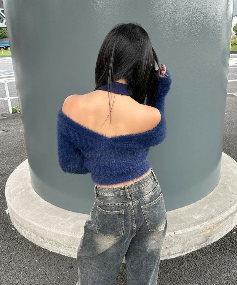 女性らしさを引き立てるシャギーニット。 ホルターネックとチョーカーの前後2way仕様で 様々な着こなしが楽しめる1枚です。 クロップド丈とタイトなシルエットは スタイルアップ効果を発揮してくれます。